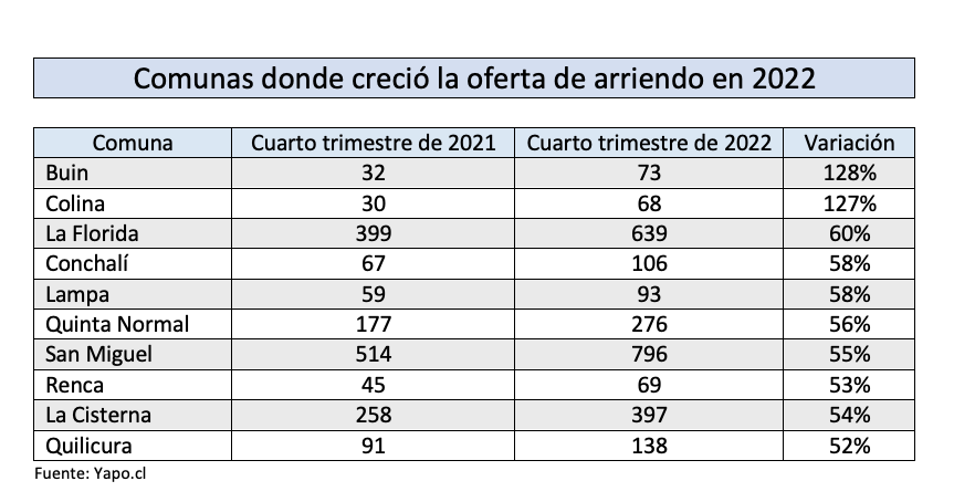 Un estudio de la plataforma de avisos clasificados Yapo.cl con información obtenida de 12.400 unidades ofertadas en su sitio, analizó en comportamiento del último trimestre de 2022 del mercado inmobiliario, detectando un aumento en la oferta de arriendo de casas y departamentos en la Región Metropolitana de 52,3% respecto al mismo período del ejercicio anterior.