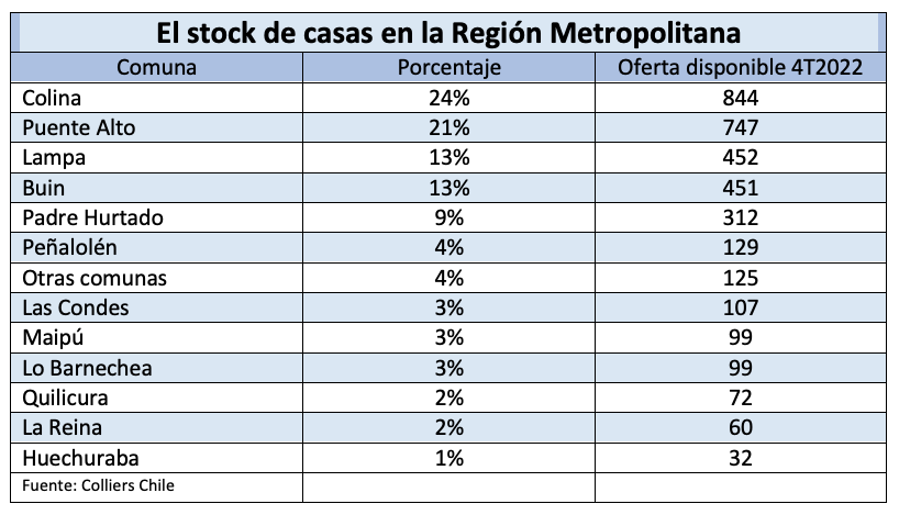 Un último análisis de Colliers Chile revisó como anda la oferta de casas nuevas en el Gran Santiago (ver Tabla). Lideró el listado Colina, con 844 casas disponibles para venta; le sigue Puente Alto, con 747 unidades; y en tercer lugar se ubica Lampa, con 452 viviendas. La medición evidenció que las casas registran un aumento del 38% en el stock disponible respecto del cuarto trimestre de 2021, sumando un total de 3.529 unidades.